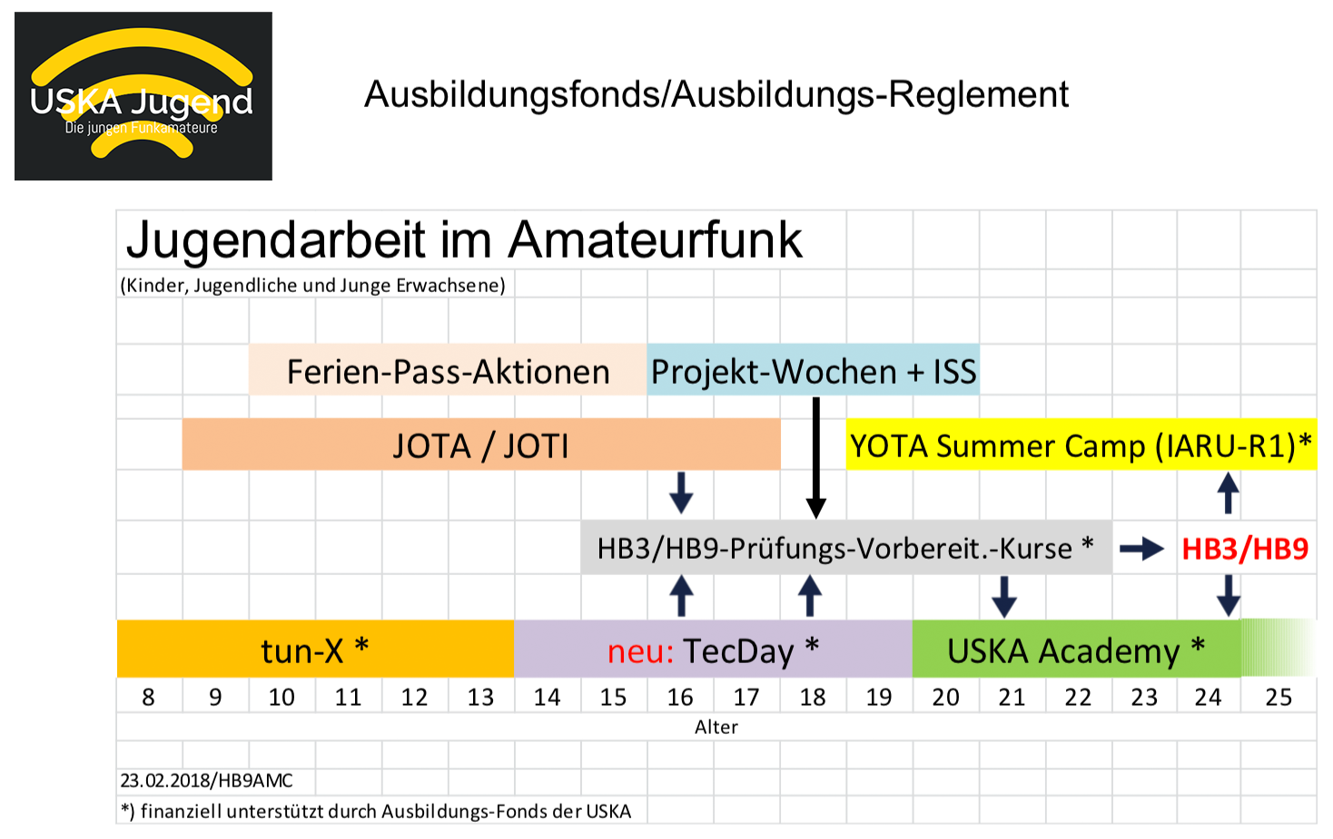 Die Jugendarbeit der USKA spricht alle Jugendliche in allen Altersklassen an. tun-X: Auf den tun Messen tunBern, tunBasel, tunSolothurn, tunOstschweiz und tunZürich wird das Interesse an Naturwissenschaften bei Jugendlichen im Altern von 6-13 Jahren gefördert. Die USKA beteiligt sich mit einem Elektronik-Experimenten an den Messen und begeistert an allen Tagen die Kinder mit dem zusammenlöten eines Bausatzes. TecDay: Die TecDays der satw unterstützen die Gymnasien in der Technik-Bildung. Während eines Tages besuchen alle Lernenden interaktive, technisch-naturwissenschaftliche Module, welche Einblick in die Praxis geben und spannende Diskussionen mit Fachleuten ermöglichen. Die USKA beteiligt sich mit dem 90-minütigem Workshop «Faszination Weltall: Satelliten-Kommunikation» und stösst auf grosses Interesse bei den Jugendlichen. USKA Academy: Die HSLU veranstaltet in Zusammenarbeit mit der USKA technisch hochstehende Tages-Workshops, die auch gerne von Studenten besucht werden. HB3/HB9 Ausbildungskurse: Die Sektionen und Kollektivmitglieder der USKA veranstalten regelmässig Ausbildungskurse zum Erlangen der HB3 und HB9 Lizenz sowie zum Erlernen des Morsens.